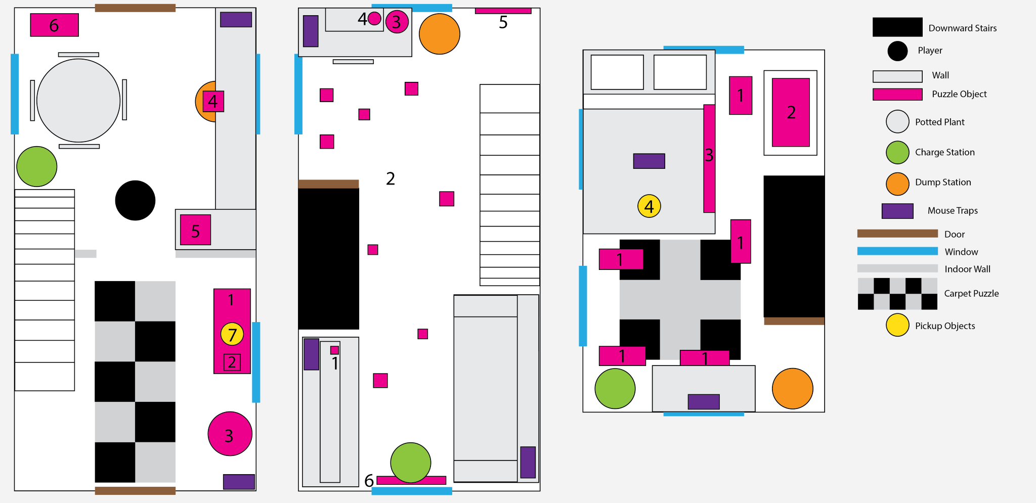 Play as a robotic vacuum cleaner left alone to deal with a big lazy cat and a mess of a house. Clean up, feed the cat and turn off all the lights before your humans get home.